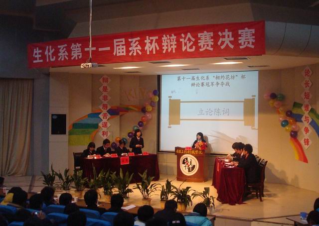 比赛分为两场进行。首场为食品09级和生技代表队就“追求越多是否越幸福”展开激烈辩论。双方辩手准备充分,一辩提纲挈领的立论陈词使辩论赛从一开始就呈现出激烈的交锋状态。在攻辩阶段,双方思维敏捷,反驳有力,赢得了现场观众的阵阵掌声。接下来,由食品08级和生工08级代表队就“科技引领生活还是生活引领科技”展开冠军争夺战。辩手们思维缜密,从各个角度对辩题进行剖析,并用诙谐幽默的语言进行论证。整场比赛高潮迭起,查桂义老师对本场决赛进行了点评,并指出比赛优缺点。最后,食品08级代表队获得比赛冠军,生工08级和食品09级代表队分别获得第二、第三名。