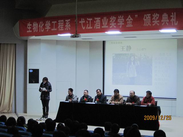 颁奖典礼在热烈的掌声中开始,首先,生化系党总支副书记章兵宣读了2009年获得“弋江酒业奖学金”的学生名单。接着,弋江酒业有限公司总经理陈曾木发表讲话,他向获奖学生表示衷心的祝贺,并鼓励大家继续努力学习。系总支潘世春书记最后作了重要讲话,他代表生化系全体师生首先感谢弋江酒业有限公司在我系设立的奖学金,感谢弋江酒业有限公司对教育的关心与支持,同时他希望获奖同学要珍惜荣誉、勤奋学习,早日成才最终回报社会。获奖学生代表王静同学发言,她说:“感谢弋江酒业带给我的这份荣誉,人生能有几回搏,人生总得搏几回,我仍需努力!”现场同学对她的发言报以热烈掌声。最后,王玉芳等18名获奖同学上台领奖,并于嘉宾、领导合影留念。